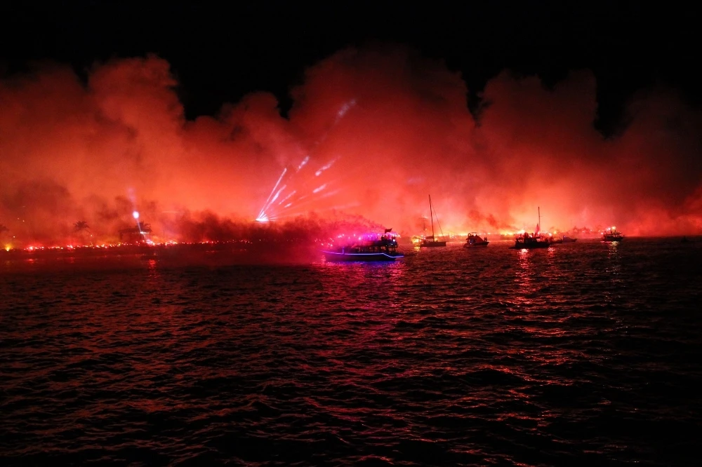 Güzelyalı, Göztepe marşları ile inlerken, saatler 22.00’yi gösterdiğinde ise klasikleşen meşale şovu başladı. Denizden fırlatılan işaret fişeği ile sahil kenarına dizilen on binlerce taraftar, aynı anda meşalelerini yaktı. Havai fişek gösterisi, ses ve ışık şovların da etkisiyle İzmir adeta alev alev yandı, meşalelerin dumanından göz gözü görmedi. Göztepe Başkanı Mehmet Sepil, yöneticiler ve futbolcular ise bir özel teknede meşale şova katıldı.