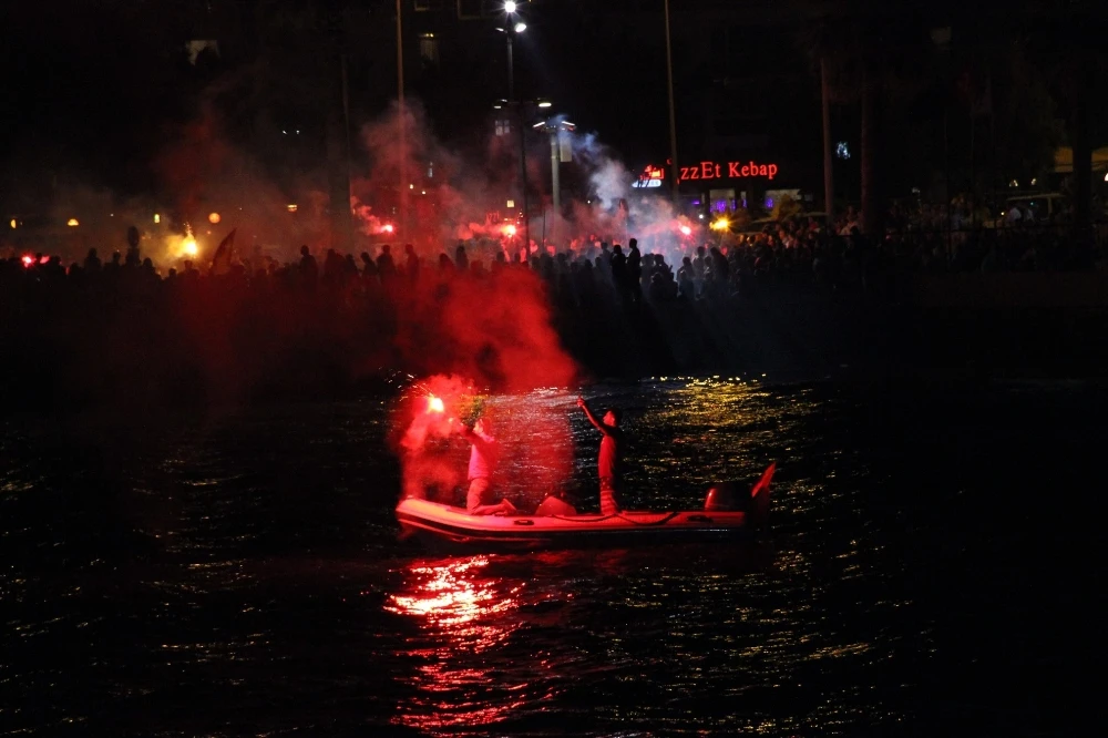 Göztepeli taraftarların meşale şovunun ardından ezeli rakipleri Karşıyakalılar da İzmir Körfezi’nin karşı tarafından meşela yakıp, nazire yaptı. İzmir’in iki yakasında yanan meşaleler körfezde renkli görüntülere sahne oldu.