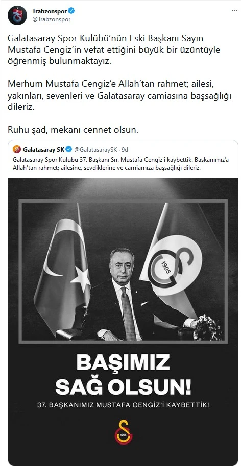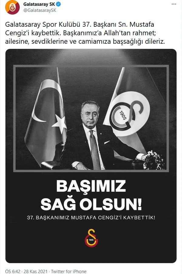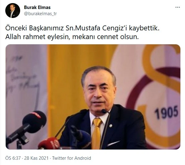 Galatasaray Kulübü Başkanı Burak Elmas yaptığı açıklamada, "Önceki Başkanımız Sn. Mustafa Cengiz'i kaybettik. Allah rahmet eylesin mekanı cennet olsun" ifadelerini kullandı.
