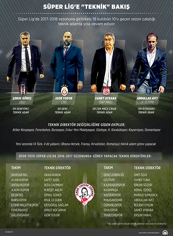 İki sezon üst üste şampiyon olan Beşiktaş, geçen sezonun flaş takımı Medipol Başakşehir'in yanı sıra Galatasaray, Trabzonspor, Gençlerbirliği, Antalyaspor, Kasımpaşa, Akhisar Belediyespor, Alanyaspor ve Sivasspor, geçen sezonu tamamlayan teknik direktörler yönetiminde yeni sezonu açacak.