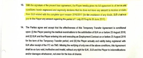 İlgili maddede, "Bu kiralık anlaşma ile birlikte, oyuncu 2016/17 sezonu için Benfica'dan herhangi bir alacağı olmadığını kabul eder ve herhangi bir ücret talebinde bulunamaz (Herhangi bir şüpheye yer bırakmamak için, Benfica 1 Temmuz 2016 tarihinden, 30 Haziran 2017 tarihine kadar oyuncuya herhangi bir ödeme yapma mecburiyetinde değil" ifadeleri yer almakta.