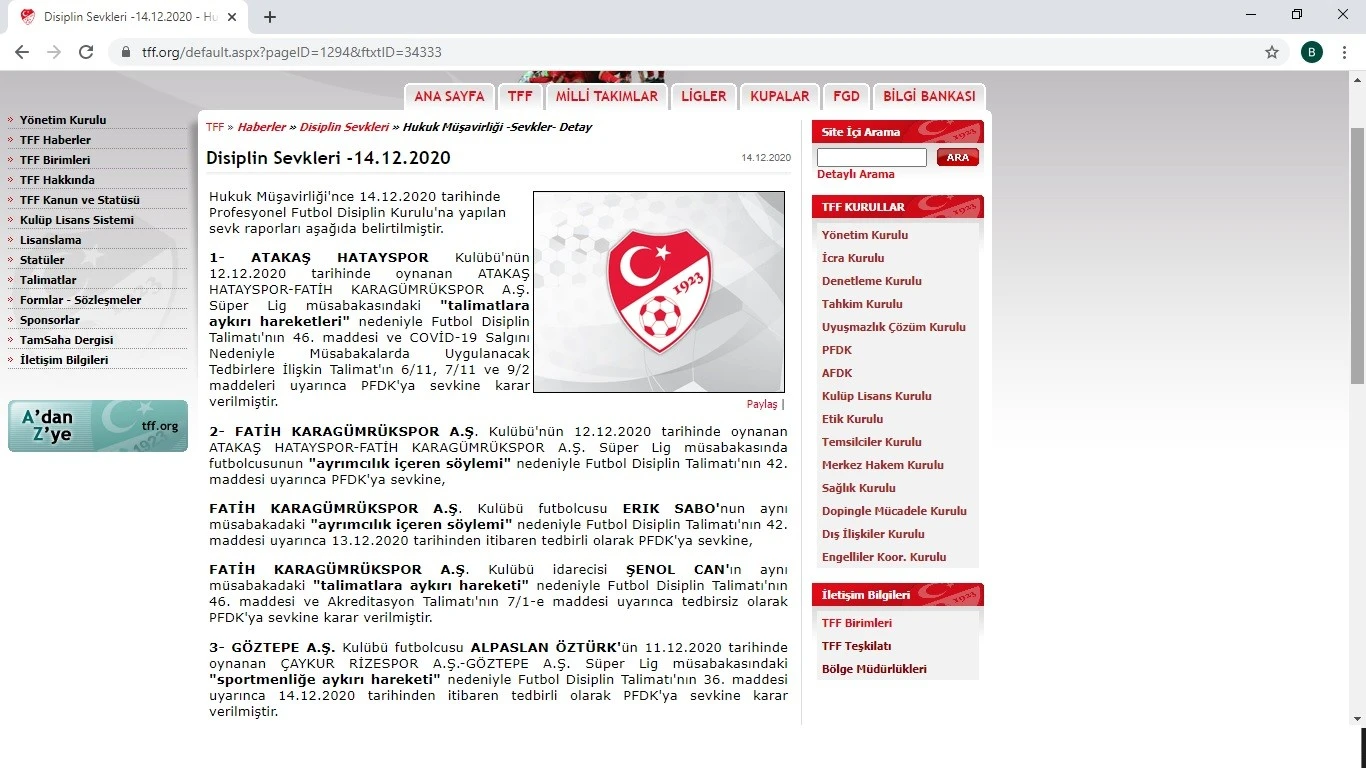 Türkiye Futbol Federasyonu, Disiplin kuruluna yapılan sevkleri açıklarken, Fatih Karagümrük'ün ismini yanlış yazdı.
