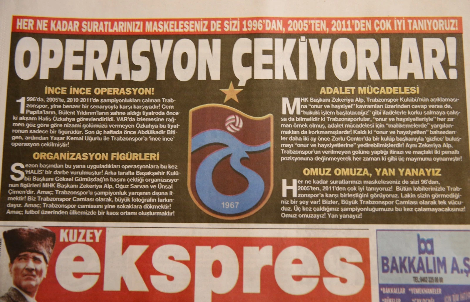 Süper Lig'in 25. haftasında Trabzonspor ile Gaziantep FK arasında oynanan ve 1-1 biten mücadelede hakem Halis Özkahya'nın, VAR incelemesinin ardından bordo - mavili takımın golü iptal etmesiyle başlayan tartışmalar devam ederken, bugün Trabzon'da yayımlanan 4 yerel gazete; Günebakış, Taka, Son Nokta ve Kuzey Ekspres, "Operasyon çekiyorlar" başlığıyla okuyucularıyla buluştu.