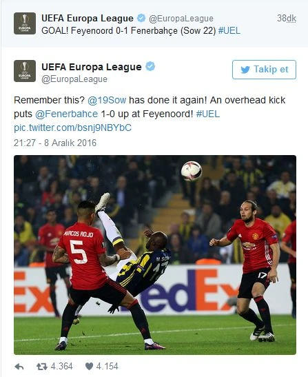 UEFA Avrupa Ligi'nin resmi Twitter hesabı, "Bunu hatırladınız mı? Sow bir kez daha yaptı! Röveşata golü, Fenerbahçe'yi Feyenoord karşısında 1-0 öne taşıdı" şeklinde bir mesaj yolladı.