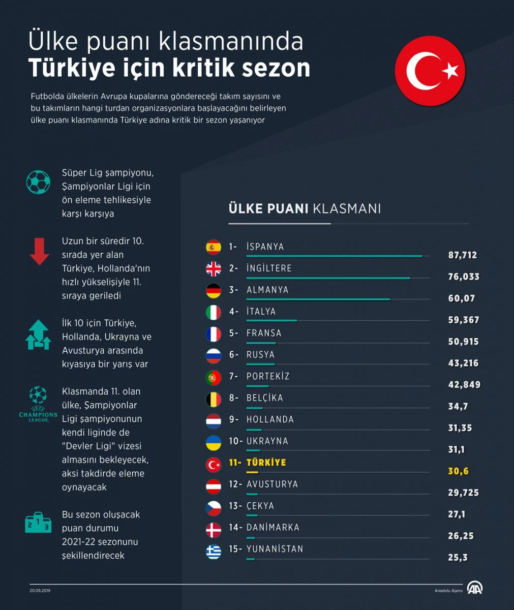 Futbolda ülkelerin Avrupa kupalarına göndereceği takım sayısını ve bu takımların hangi turdan organizasyonlara başlayacağını belirleyen ülke puanı klasmanında Türkiye adına kritik bir sezon yaşanıyor.