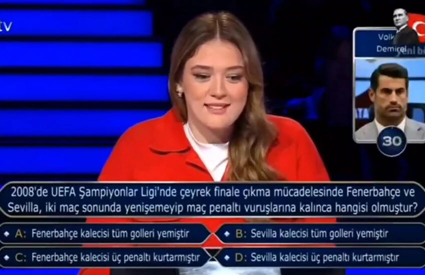 Başarılı voleybolcu, “2008’de UEFA Şampiyonlar Ligi’nde çeyrek finale çıkma mücadelesinde Fenerbahçe ve Sevilla, iki maç sonunda yenişemeyip maç penaltı vuruşlarına kalınca hangisi olmuştur?” sorusunun cevabını bilemeyince telefonla joker hakkını kullanmak istedi.