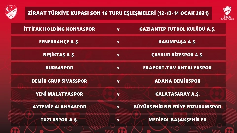 Ziraat Türkiye Kupası son 16 turu eşleşmeleri Riva Hasan Doğan Milli Takım Kamp Eğitim Merkezi’nde yapılan kura çekimi ile belli oldu. Tek maç eleme usulüne göre gerçekleştirilecek olan son 16 turunda mücadeleler ise 12, 13 ve 14 Ocak tarihlerinde oynanacak. Son 16 turunda maçlarda Video Yardımcı Hakem (VAR) sistemi de kullanılacak. Kura çekiminde Türkiye Futbol Federasyonu Maç Planlama Müdürü Besim Yalçın, Türkiye Futbol Federasyonu İcra Kurulu Üyesi, Ümit Milli Takım ve Genç Takımlar Sorumlusu Hamit Altıntop ile TFF Gelişim Direktör Yardımcısı Rüştü Reçber katılım gösterdi.