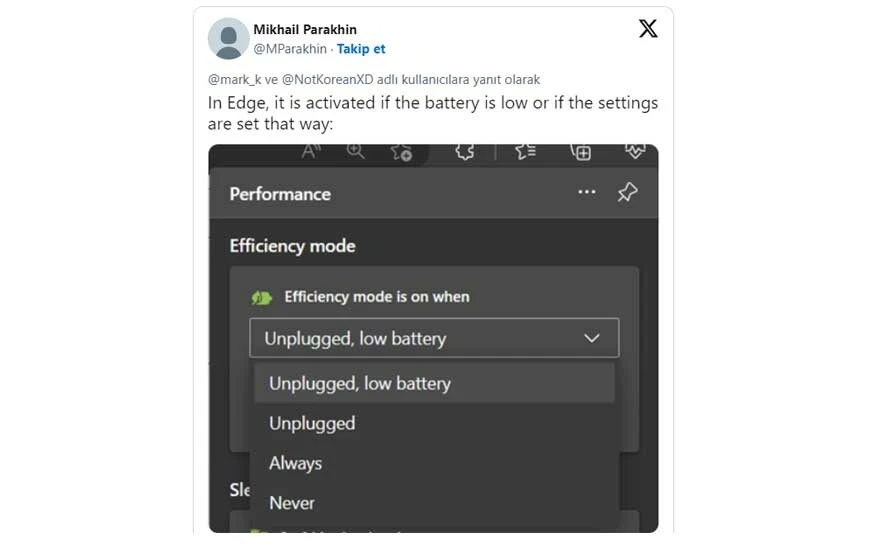 Microsoft Edge tarayıcısının güç tasarrufu sağlamak için Verimlilik Modu özelliği bulunuyor. Bu da pek çok sekmenin arka planda çalışmasını engelliyor.