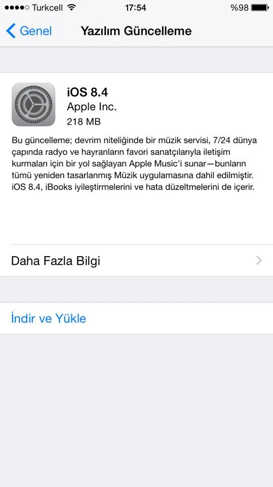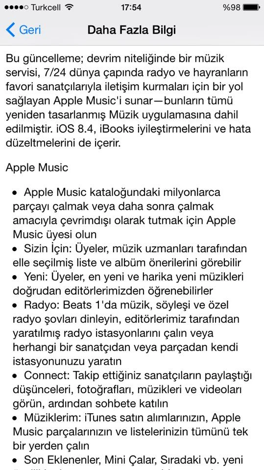 Apple, her ne kadar geride bıraktığımız WWDC 2015 geliştiriciler konferasında yeni işletim sistemi iOS 9'u duyurmuş olsa da şu sıralar tüm gözler ara güncelleme iOS 8.4'ün üzerindeydi. iOS 8.4'ün bu denli beklenmesinin sebebi ise performans iyileştirmeleri ve hata düzeltmelerinin yanında getirdiği Apple Music servisiydi. Apple verdiği sözü tuttu ve iOS 8.4 güncellemesiyle beraber müzik servisi, 7/24 dünya çapında radyo ve hayranların favori sanatçılarıyla iletişim kurmaları için bir yol sağlayan Apple Music'i de yayınladı. İlk üç ay ücretsiz kullanılabilecek olan Apple Music'in ülkemizdeki aylık fiyatı ise 9.99 TL olacak. Ayrıca aynı aileye mensup toplamda 6 kişi, aylık toplam 14.99 TL'ye bu hizmetten faydalanabilecek.Diğer taraftan 218 MB boyutundaki iOS 8.4 güncellemesi iBook iyileştirmelerini de içeriyor.Apple tarafından "Devrim niteliğinde" denilen müzik uygulaması Apple Music'i de içeren iOS 8.4 güncellemesini cihazınızın Yazılım Güncellemeleri bölümünden yükleyebilirsiniz.