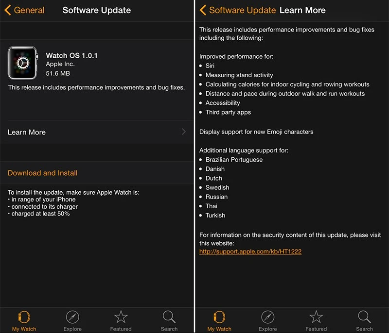 51.6 MB boyutundaki Watch OS 1.0.1, Türk kullanıcılar açısından ayrıca bir öneme sahip. Bu güncellemeyle beraber Apple Watch Türkçe desteğine kavuştu. Henüz ülkemizde satışa sunulmamış olmasına rağmen yapılan bu hamle, Apple Watch’ın Türkiye’ye yakın zamanda gireceğinin habercisi. Türkçe’nin yanında Rusça, Portekizce ( Brezilya için ), Danca, Flemenkçe, İsveççe, Tayca dillerine de destek geldi.