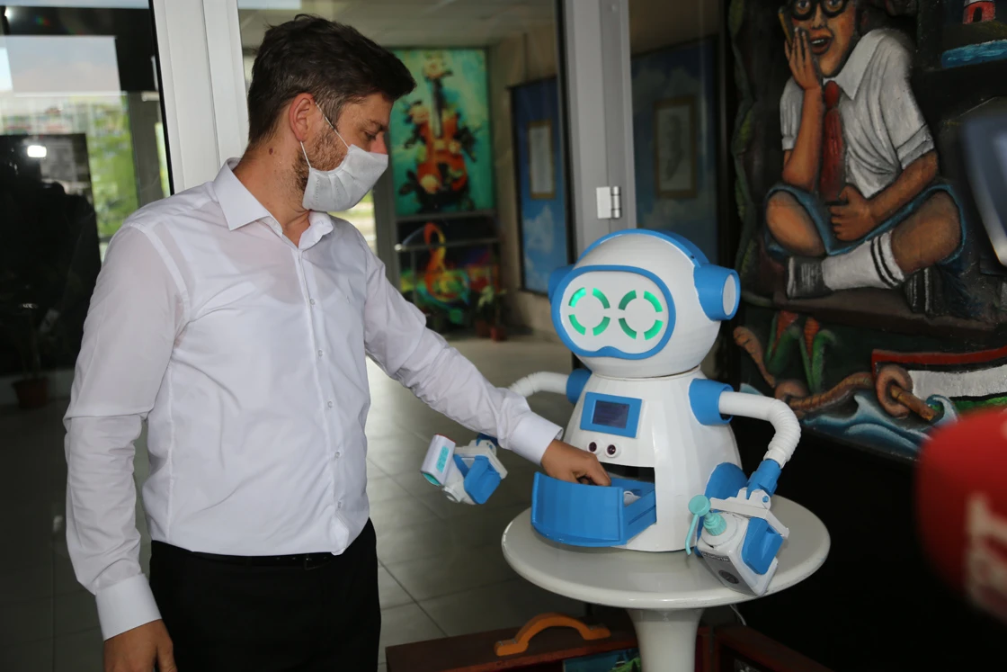 Koronavirüs salgınının önlenmesine yönelik tasarlanan robot, ateşini ölçtüğü vatandaşlara dezenfektan sıkıp maske veriyor. Robot, ateşi düşük çıkanlara kapıyı otomatik olarak açarken, yüksek çıkanlara ise kapıyı açmayarak yetkili kişiye mesaj bildirimi yapıyor.