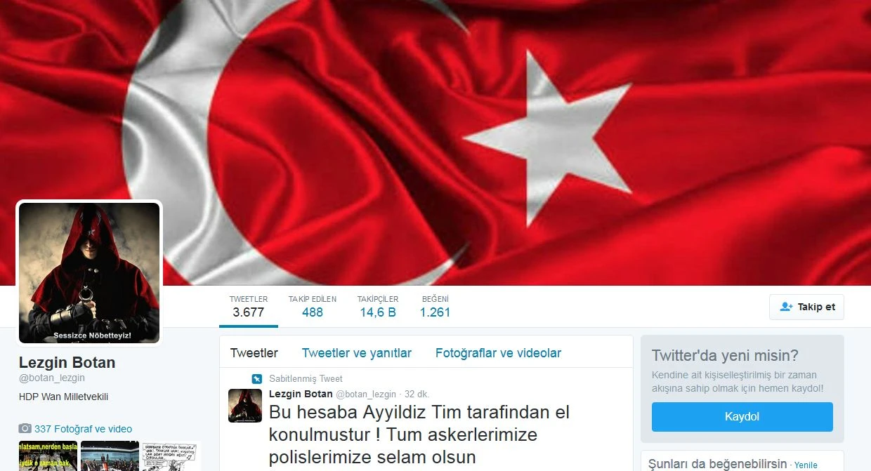 Ayyıldız Tim HDP'ye karşı olan siber saldırılarına devam ediyor. Geçtiğimiz günlerde Ayyıldız Tim, Figen Yüksekdağ'ın resmi Facebook hesabını hacklemiş ve sayfanın eski yöneticileriyle adeta siber alemde savaş içine girmişti. Ayyıldız Tim şimdi de HDP Van Milletvekili Lezgin Botan'ın Twitter hesabına el koydu ve adresten askerlerimize, polislerimize selam gönderdiler.