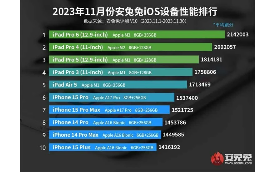 Apple cihazların en son aylık derecelendirmesini yayınlayan AnTuTu’ya göre iPad Pro, en güçlü cihazlar arasında ilk 4’te yer almayı başardı. iPad Pro’ları ise yeni nesil iPhone 15 serisi modeller takip etti.