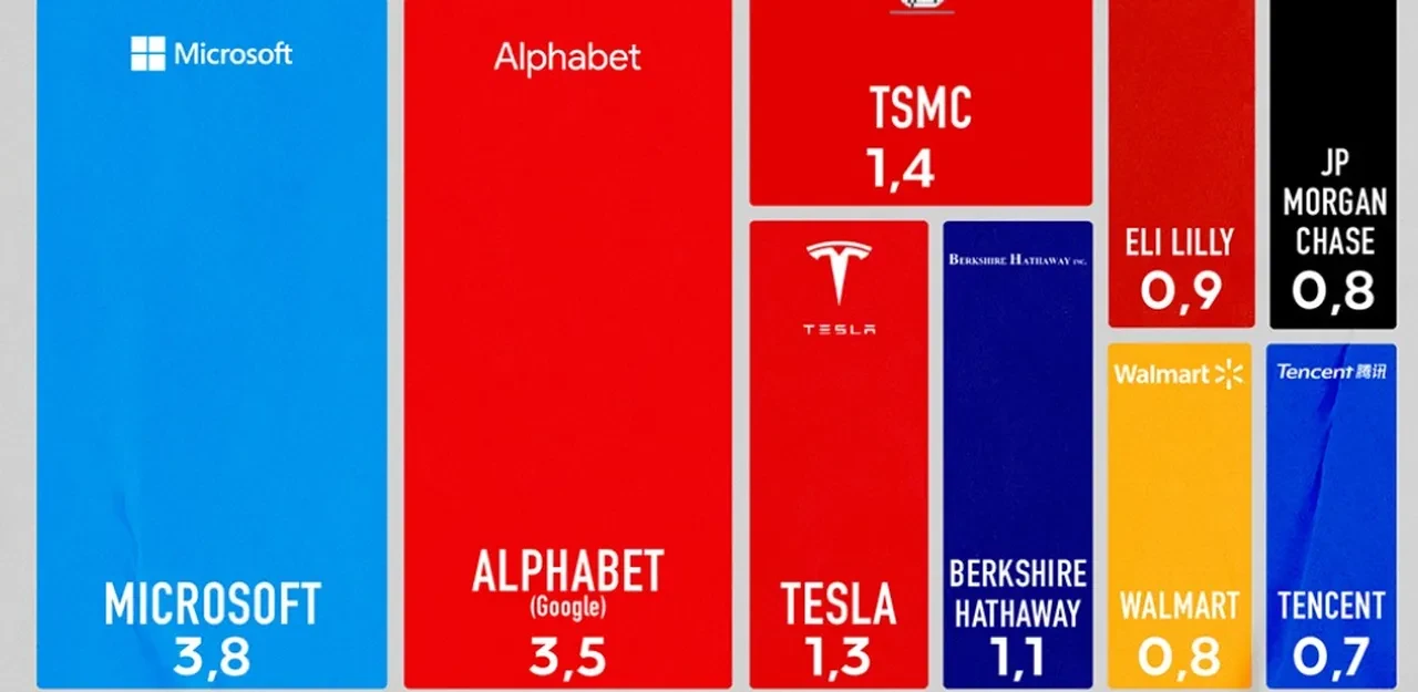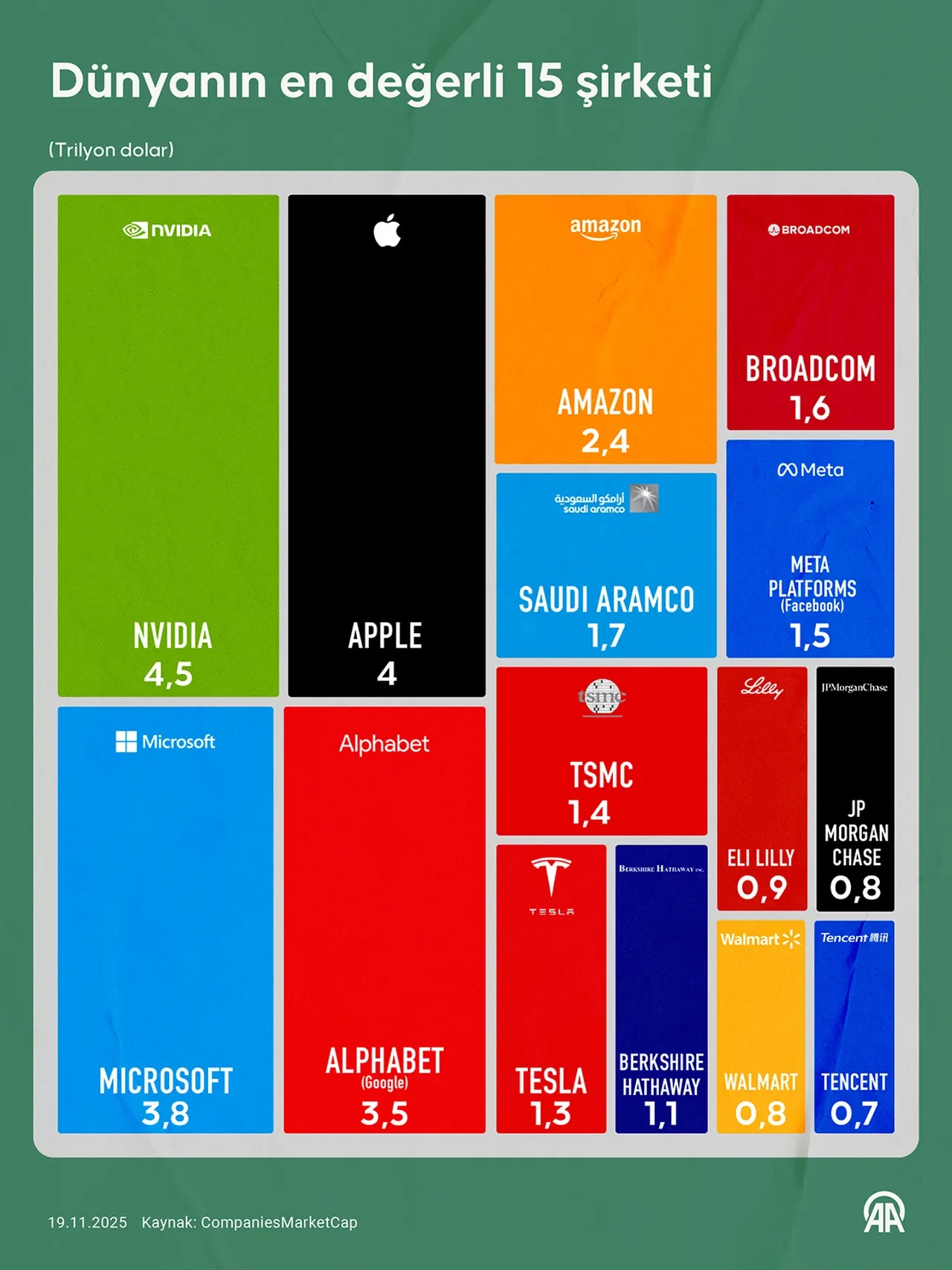 Listede ilk sırada 4,58 trilyon dolarla dünyanın önde gelen çip üreticisi Nvidia yer alırken onu 4 trilyon dolar ile iPhone'un sahibi Apple takip ediyor. Aynı zamanda IOS işletim sisteminin de sahibi olan Apple en büyük gelirlerinden birini App Store'dan elde ediyor. Şirket, kullanıcıların indirdikleri uygulama ve aboneliklerden ciddi miktarda gelir sağlıyor.