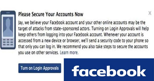 Sosyal medya devi, “Facebook hesabının ve diğer online hesaplarının devlet destekli aktörler tarafından saldırı altında olduğuna inanıyoruz. Facebook girişindeki onayları aktif hale getirmen hesabına başkalarının erişimini engelleyecektir. hesabına yeni bir bilgisayar ya da cihazdan bağlanıldığında biz cep telefonuna bir güvenlik kodu göndereceğiz ve bu sayede hesabınıza giriş yapabileceksiniz. ayrıca diğer hesaplarınızın güvenliğini de gözden geçirmenizi tavsiye ederiz”  şeklinde kullanıcılarına uyarı mesajı gönderecek.
