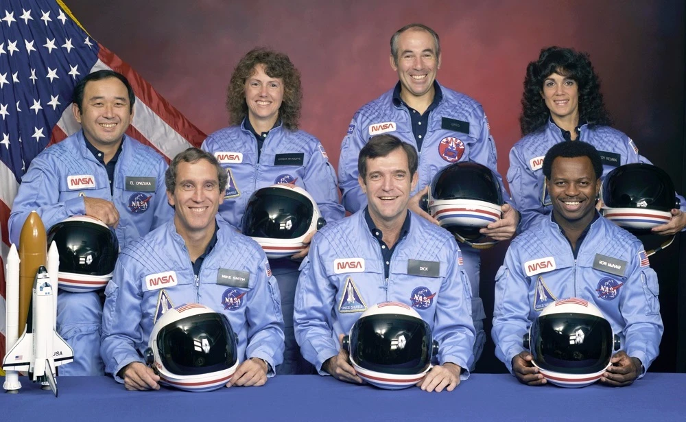 Challenger ekibi faciadan birkaç gün önce bu hatıra fotoğrafını çektirmişti. Futbol topunun sahibi Ellison Onizuka, ayakta duranların en solunda yer alıyor.