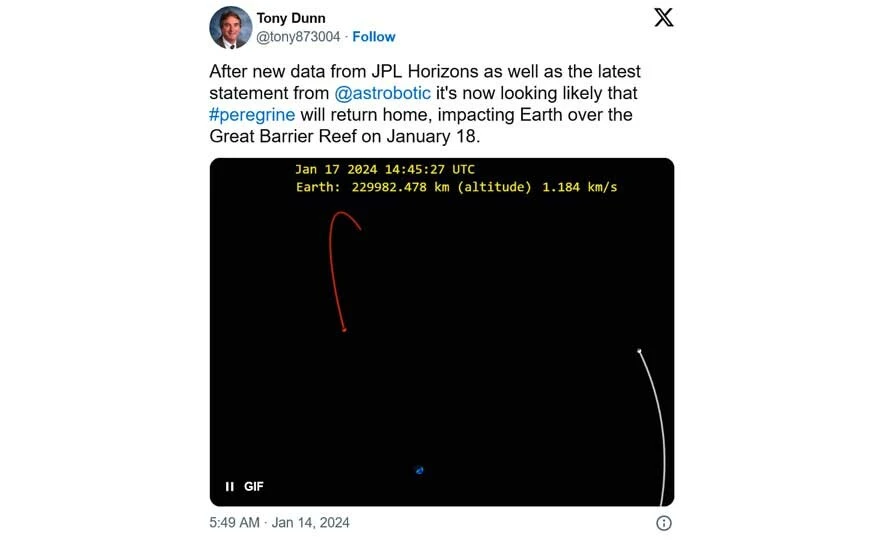 Ay'ın yörüngesine gönderilmesi hedeflenen araç, yakıt ihmali nedeniyle görevini yarıda bıraktı. Bu nedenle Astrobotic, NASA ile birlikte takip ettiği Peregrine'i Dünya atmosferine getirerek 18 Ocak'ta imha edecek.