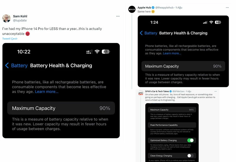 Bir paylaşımda iPhone 14 kullanıcısı, 11 ay önce aldığı telefonunun pil sağlığının %90’ın altına düştüğünü söyledi. Başka bir kullanıcı ise yine aynı telefonun pil sağlığının %87’ye düştüğünü gösteren görüntüler paylaştı.