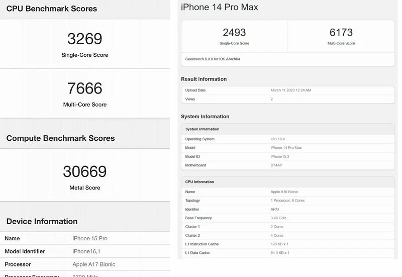 Geekbench verilerine göre A17 işlemci, tek çekirdekli çalışma puanında A16'dan %31 daha yüksek olan 3269 puan aldı. Çoklu çekirdekli testte ise iPhone 15 Pro'da kullanılacak işlemci, bir önceki A16'dan %24 daha iyi performans sergiledi.