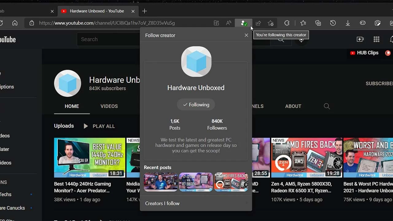 Edge tarayıcısının yeni işlevi, Canary sürümde Reddit kullanıcıları tarafından keşfedildi. Kullanıcılar YouTube sayfalarının adres çubuğunda yeni bir takip düğmesinin eklendiğini bildirdi. Şu anda yeni takip etme düğmesi beta aşamasında olduğu için tam çalışma şekli nasıl olacak bilinmiyor. Ancak koleksiyonlar’da oluşturulan özel akışı sayesinde, takip ettiğiniz içerik oluşturucularının son gönderilini görebileceksiniz.
