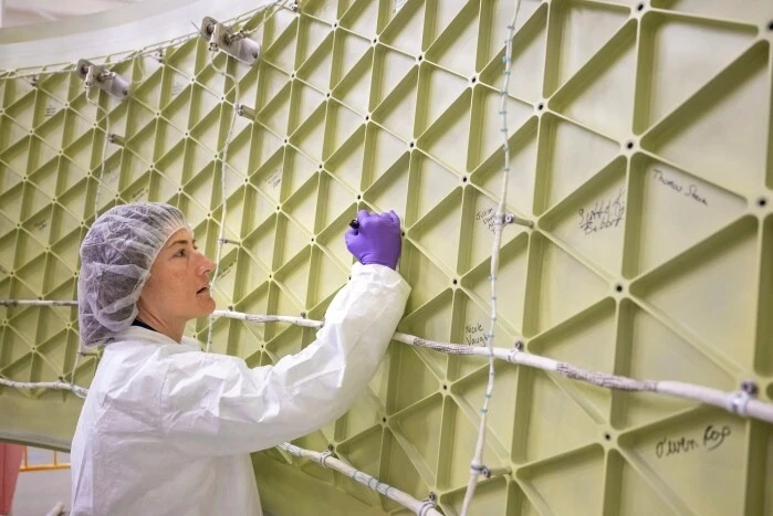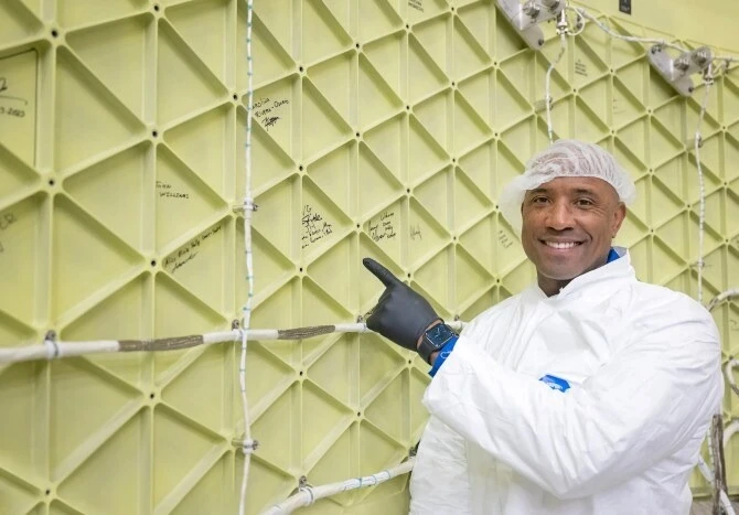 'in haberine göre NASA astronotları Victor Glover, Reid Wiseman ve Christina Koch ile CSA (Kanada Uzay Ajansı) astronotu Jeremy Hansen, bu hafta başında Huntsville, Alabama'daki NASA Marshall Uzay Uçuş Merkezi'nde SLS (Uzay Fırlatma Sistemi) roketinin aşama adaptörünü imzaladılar.