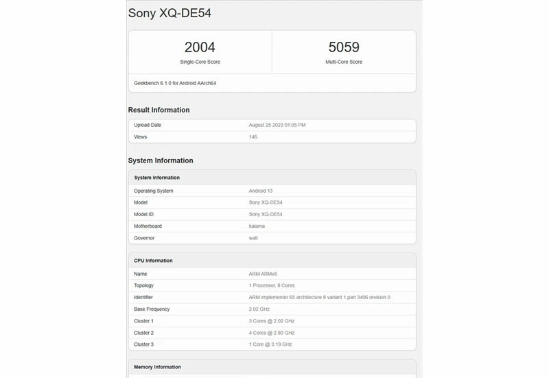 Geekbench çalışma puanı sonuçlarına göre Xperia 5 V, Qualcomm Snapdragon 8 Gen 2 işlemciyle donatılırken, 8 GB RAM ve Android 13 tabanlı işletim sistemi önceden yüklenmiş olarak ortaya çıktı.