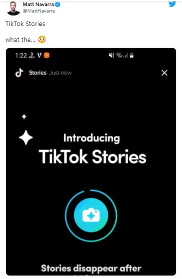 TikTok, 24 saat sonunda otomatik olarak silinen hikaye paylaşma özelliği üzerinde çalışıyor. TikTok'un yeni özelliğini sosyal medyada teknoloji paylaşımlarıyla tanınan Matt Navarra paylaştı. Navarra, Twitter hesabı üzerinden paylaştığı gönderiye TikTok'un yeni özelliğinin ekran görüntülerini de ekledi.