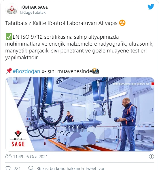 Savunma Sanayii Araştırma ve Geliştirme Enstitüsü (TÜBİTAK SAGE)  hava-hava füzesi Bozdoğan'ın x-ışını muayenesine ilişkin, "EN ISO 9712 sertifikasına sahip altyapımızda mühimmatlara ve enerjik malzemelere radyografik, ultrasonik, manyetik parçacık, sıvı penetrant ve gözle muayene testleri yapılmaktadır" açıklamalarda bulundu.