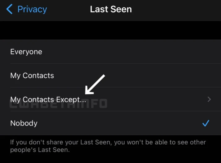 WhatsApp şimdide kullanıcıların belirli kişiler için ‘Son görülme, Profil fotoğrafı ve Hakkında’ kısmında sadece “Herkes, Kişilerim ve Hiç kimse” seçenekleri mevcuttu. Kullanıcılar söz konusu bilgilerini sadece bu seçeneklere göre saklayabiliyordu. Artık yeni gelecek olan güncellemeyle birlikte bilgilerinizi istediğiniz insanları seçerek onlardan da gizleyebileceksiniz.