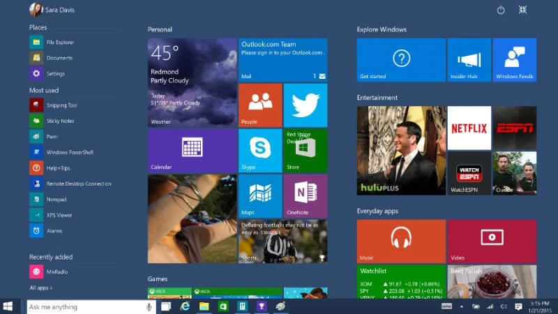 Windows 10'un arabiriminde dikkat çeken en önemli özellik klasik masaüstü görünümünün korunmuş olması. Özellikle Windows 7 ile olan benzerliği dikkatlerden kaçmıyor. Daha da önemlisi ise Başlat menüsünün sabit bir şekilde yine sol alt bölmede kendine yer bulması denilebilir.