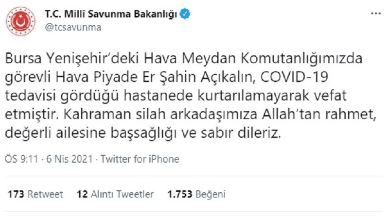 Milli Savunma Bakanlığından yapılan açıklamada, "Bursa Yenişehir'deki Hava Meydan Komutanlığımızda görevli Hava Piyade Er Şahin Açıkalın, COVID-19 tedavisi gördüğü hastanede kurtarılamayarak vefat etmiştir. Kahraman silah arkadaşımıza Allah'tan rahmet, değerli ailesine başsağlığı ve sabır dileriz." denildi.
