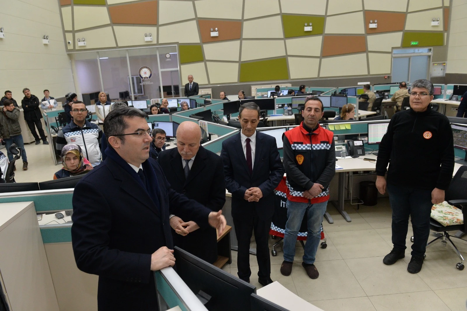 Vali Memiş, “En modern, en donanımlı 112 binasında çalışan arkadaşlarımızın yeni yılının kutlamaya geldik. Şuanda binlerce polis, jandarmamızla beraber vatandaşlarımızın yeni yıla sağlıkla, huzurla girebilmeleri temennisiyle görevimizin başındayız. 24 saat görev yapan ekiplerimizin yanında olduğumuzu bildirmek maksadıyla ziyaret ettik. Erzurum’daki 112 ekibi Türkiye’nin belki de en iyi arama kurtarma ekiplerinden birisi diyebiliriz. Her gün yolda kalan araca, yolda kalan vatandaşlara müdahale ediyoruz. Kamu görevlilerimiz bayram, seyran demeden görevlerinin başındalar. Bizde onlara moral açısından ziyaret ediyoruz” diye konuştu.