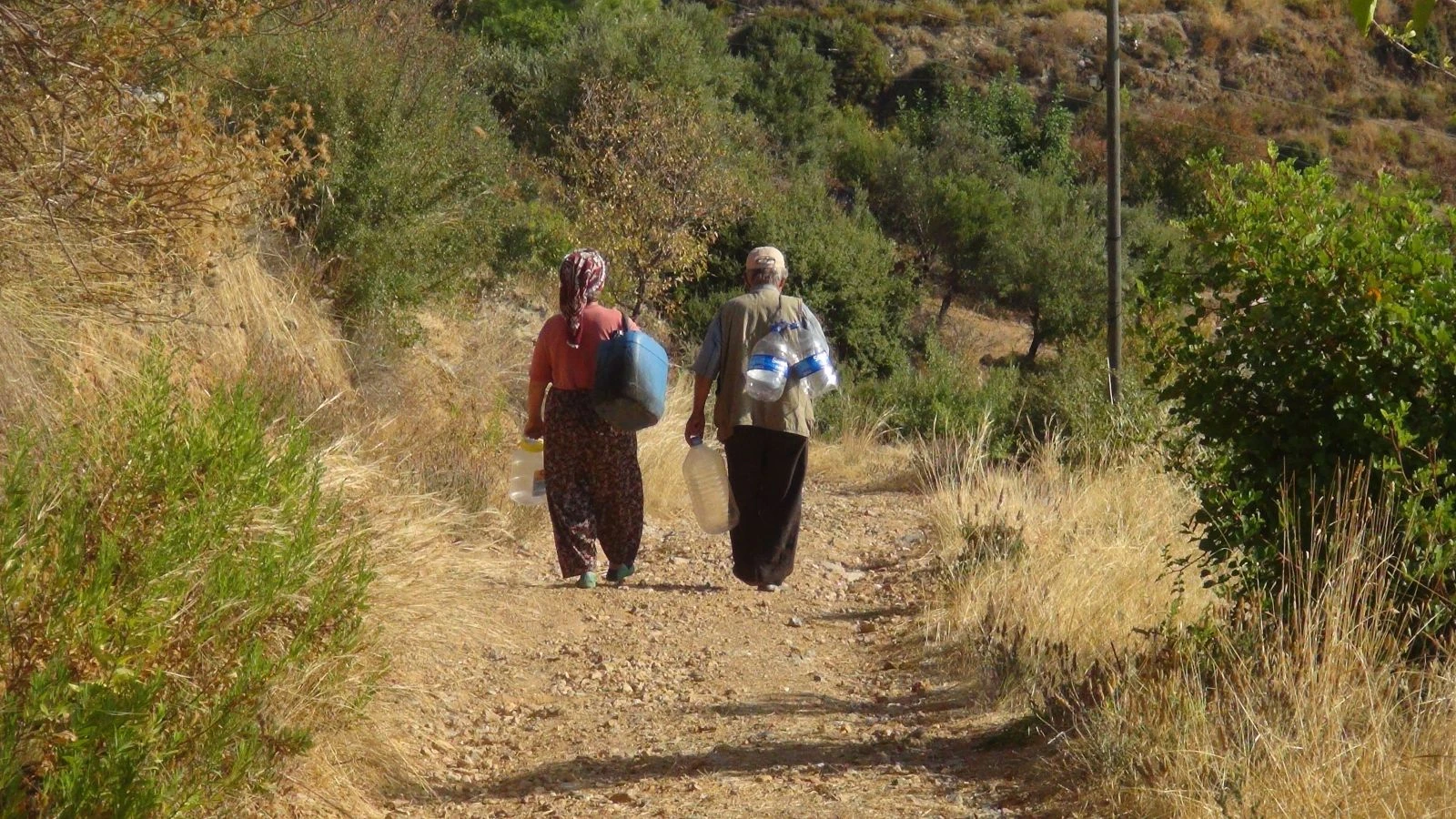 59 yaşındaki Düriye Demiral, 72 yaşındaki Hüseyin Demiral ile birlikte iki günde bir yaklaşık 500 metre mesafedeki en yakın komşularından su almaya gidiyor. Yaşlandıkları için büyük bidonları taşıyamayan çift, 5 litrelik su bidonlarıyla evlerine su çekiyor.