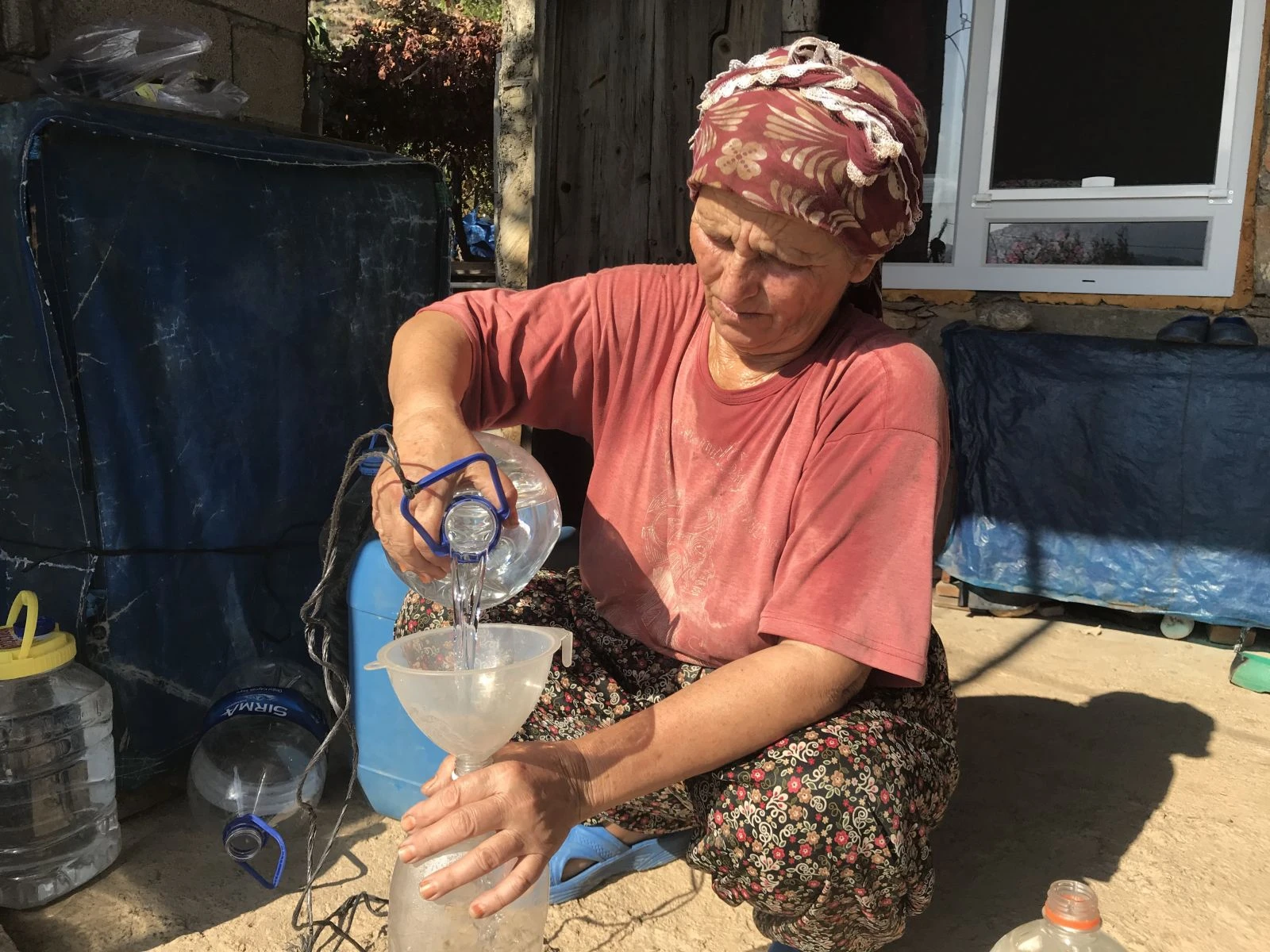 Bidonlarla evlerine getirdikleri suyu dolapta saklamak için huni yardımıyla daha küçük pet şişelere dolduran Duriye Demiral, suyu dökmemek için büyük bir özen gösteriyor.