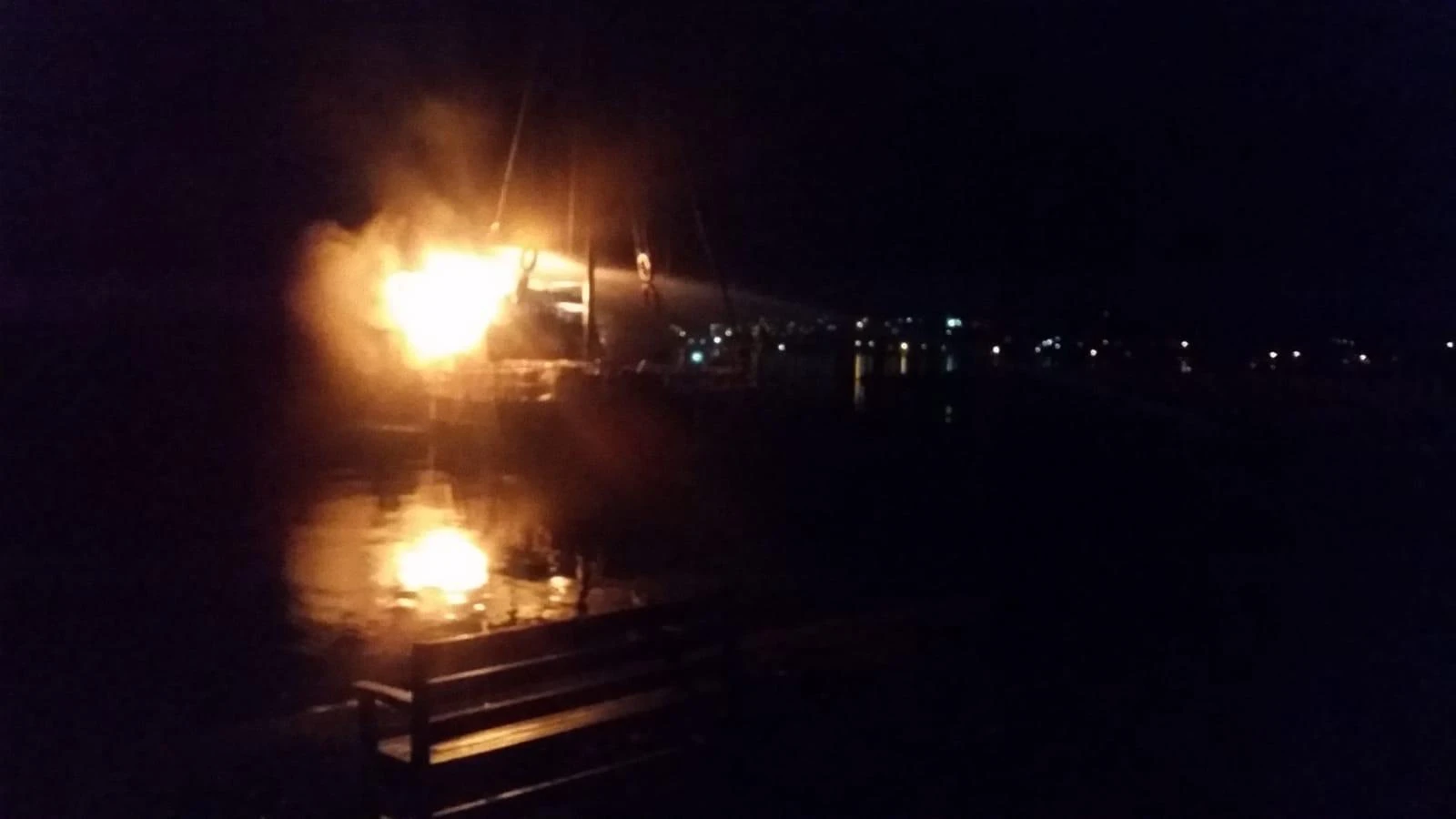 Bodrum ilçesi Yalıkavak Mahallesi balıkçı barınağında demirli olan 8 metrelik “Mavikuş” isimli ahşap yat henüz bilinmeyen bir nedenden dolayı alev aldı.