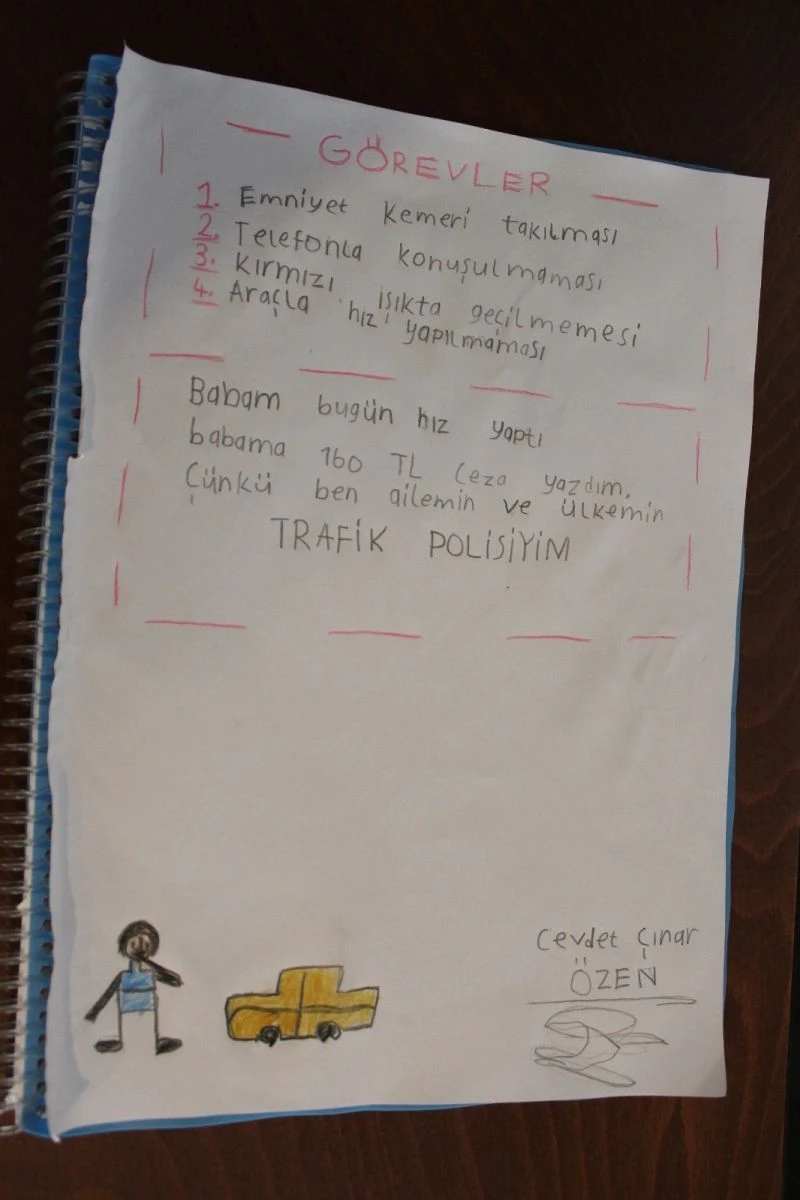 Kendisine verilen görevleri göz önünde bulunduran minik Çınar, görevi başında babasının hız yaptığını görerek kendisini uyardı ancak kurallara uymayarak hız yaptığı için babasına 160 TL trafik cezası yazdı.