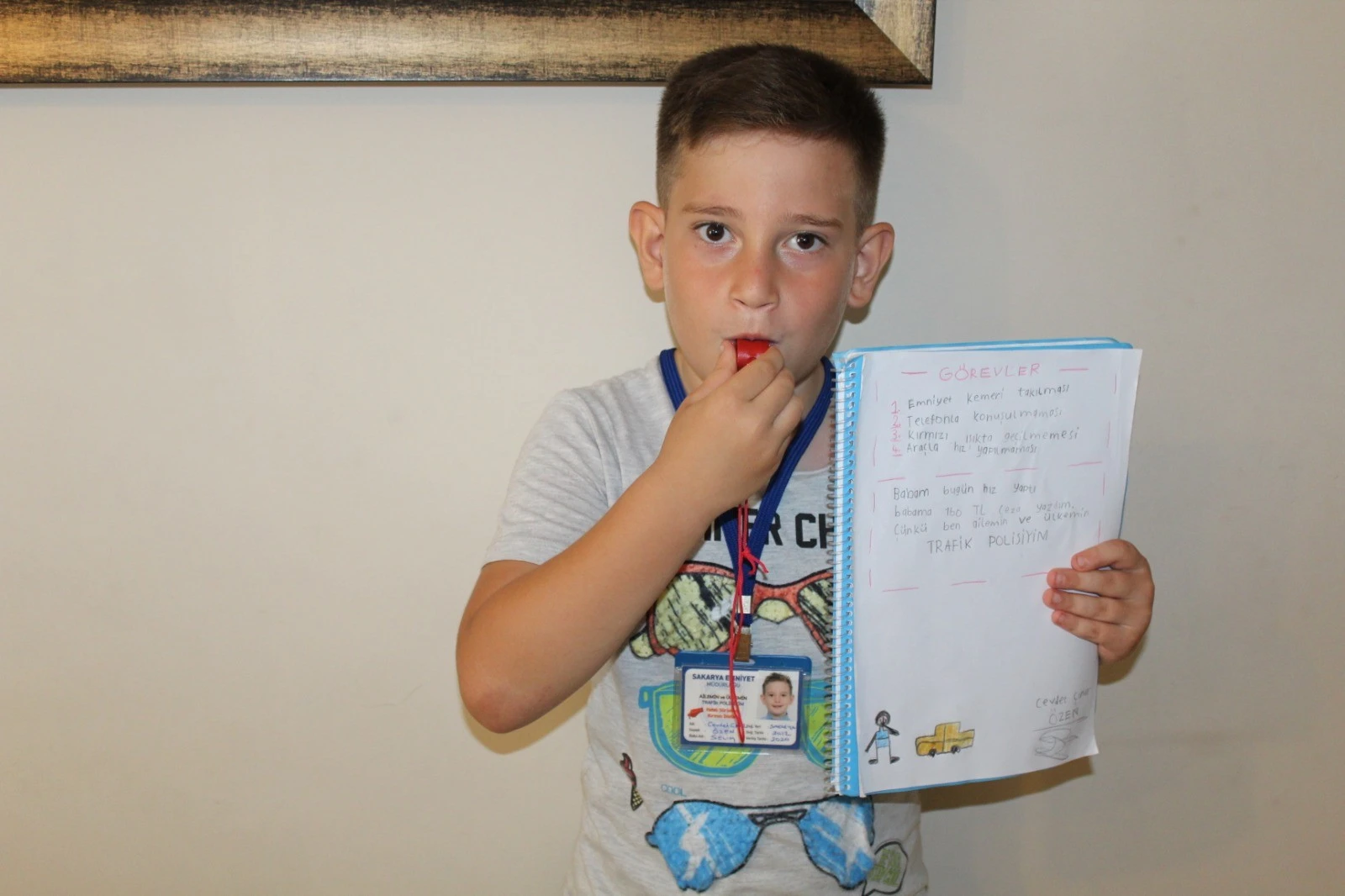 Kendisine verilen görevlerin yazılı olduğu kağıda, “Babam bugün hız yaptı, babama 160 TL ceza yazdım. Çünkü ben ailemin ve ülkemin trafik polisiyim” yazan Çınar’ın görüntüleri ailesinin sosyal medya hesabında da paylaşıldı.
