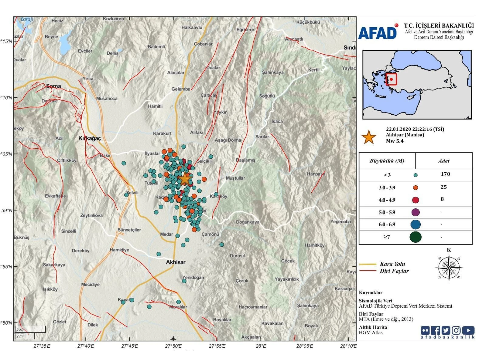 - AFAD: "Manisa Akhisar'da meydana gelen 5,4 büyüklüğündeki deprem, Gelenbe sağ yönlü doğrultu atımlı fay üzerinde gelişmiş olup, 09.25 itibarıyla 212 adet artçı deprem olmuştur. En büyüğü 4,3 olmak üzere 4,0'den büyük 8 artçı deprem meydana gelmiştir."