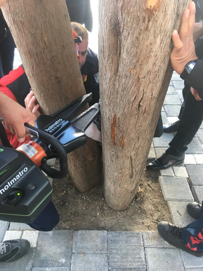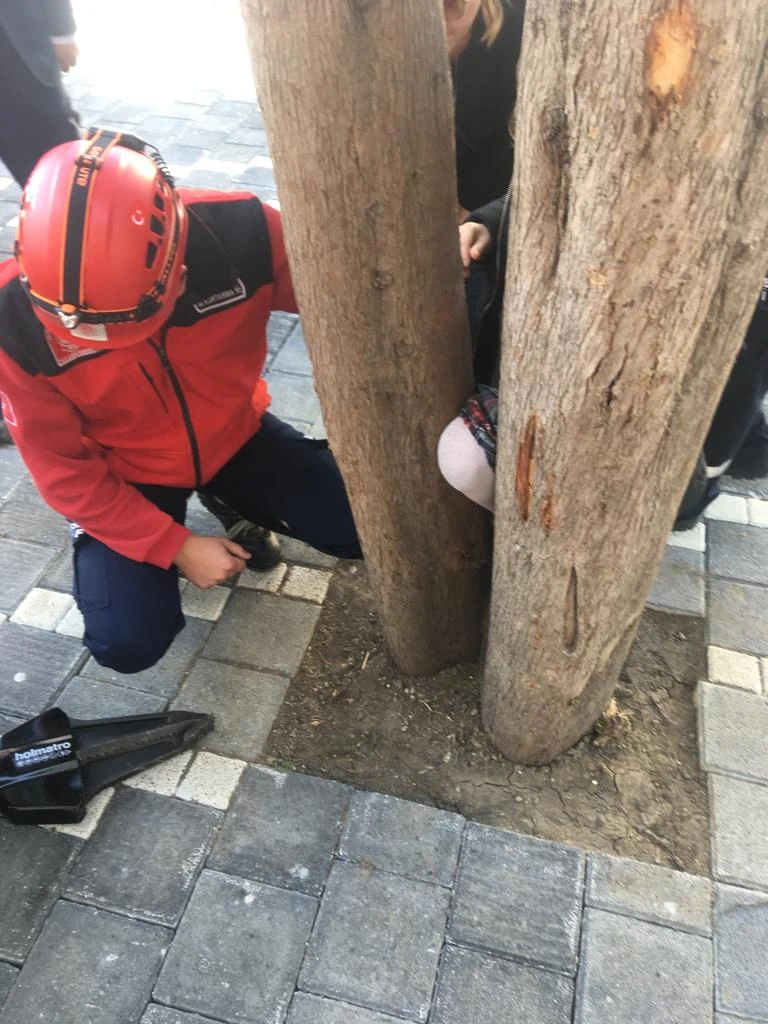 Balıkesir'in merkez Karesi ilçesinde tenefüste oyun oynadığı okul bahçesinde bacağı ağaç arasına sıkışan öğrenci Hülya Koyunoğlu'nu (8), itfaiye ekipleri kurtardı.