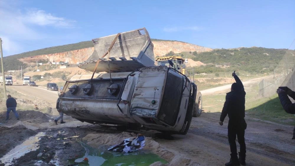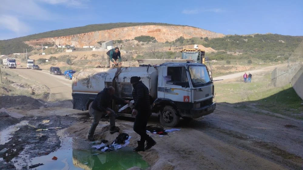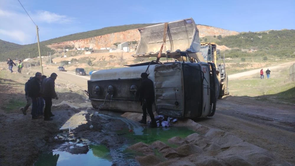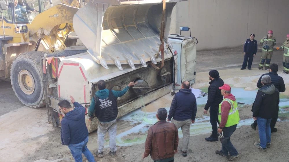 Kaza yapan tanker bölgedeki bir maden ocağından çağrılan kepçe yardımı ile kaldırıldı.