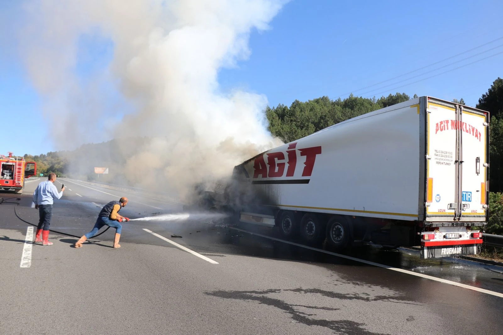 Saat 14.20 sıralarında TEM Otoyolu Köroğlu Park mevkiinde, Gebze’den Adana’ya elektronik malzeme ve tıbbi ilaç taşıyan Uğur Yıldırım idaresindeki 34 F 6303 plakalı tır, seyir halindeyken yanmaya başladı.