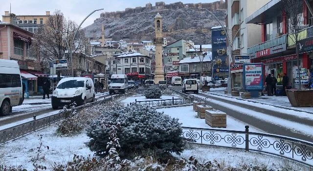 Bitlis'in Ahlat ilçesinde sabah saatlerinde etkili olan kar yağışı kenti beyaza bürüdü.