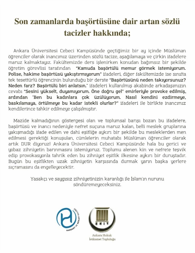 Ders esnasında başörtülü öğrenciye ‘başörtüsünü neden takıyorsunuz? Neden farz? Başörtülü biri anlatsın' dediği iddia edilen öğretim üyesinin sözleri üzerine Cebeci Kampüsü öğrencileri öğretim görevlisini protesto ederek basın açıklamasında bulundu.