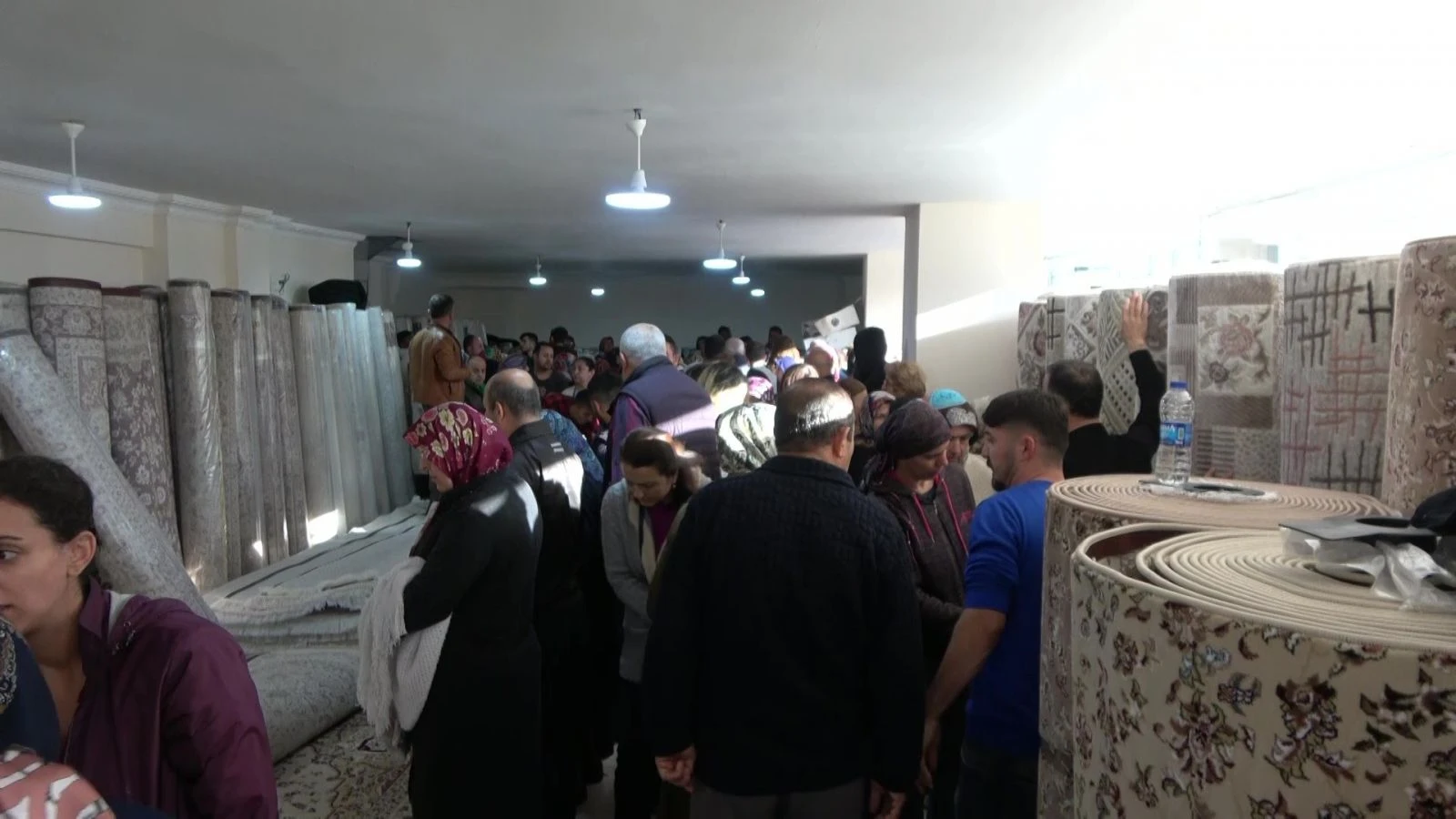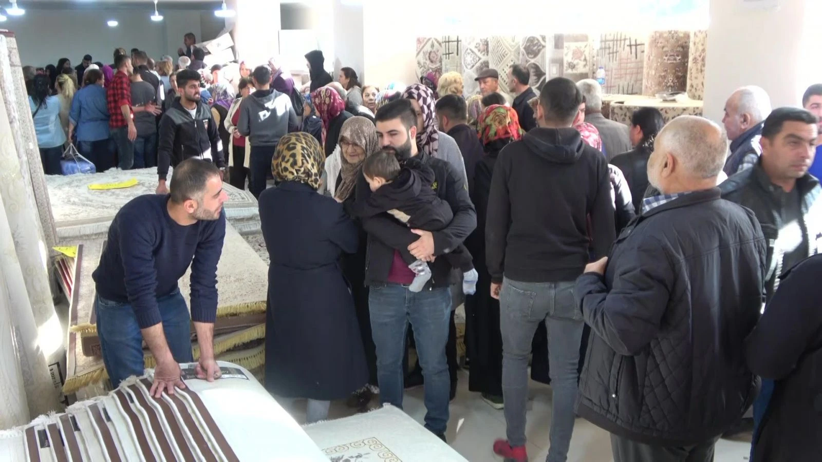 Vatandaşlar halı, paspas, battaniye gibi ürünleri alabilmek için birbiriyle yarıştı.