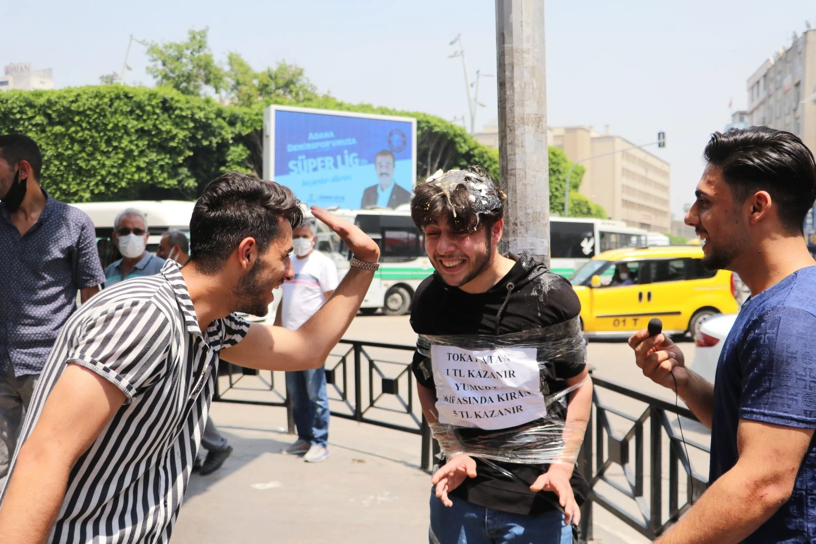 Adana’da bir Youtuber, arkadaşını şehrin göbeğinde direğe bağlayıp 1 lira karşılığında tokat attırdı, 5 lira karşılığında kafasında yumurta kırdırttı. Gençlere vatandaşlar tepki gösterdi.