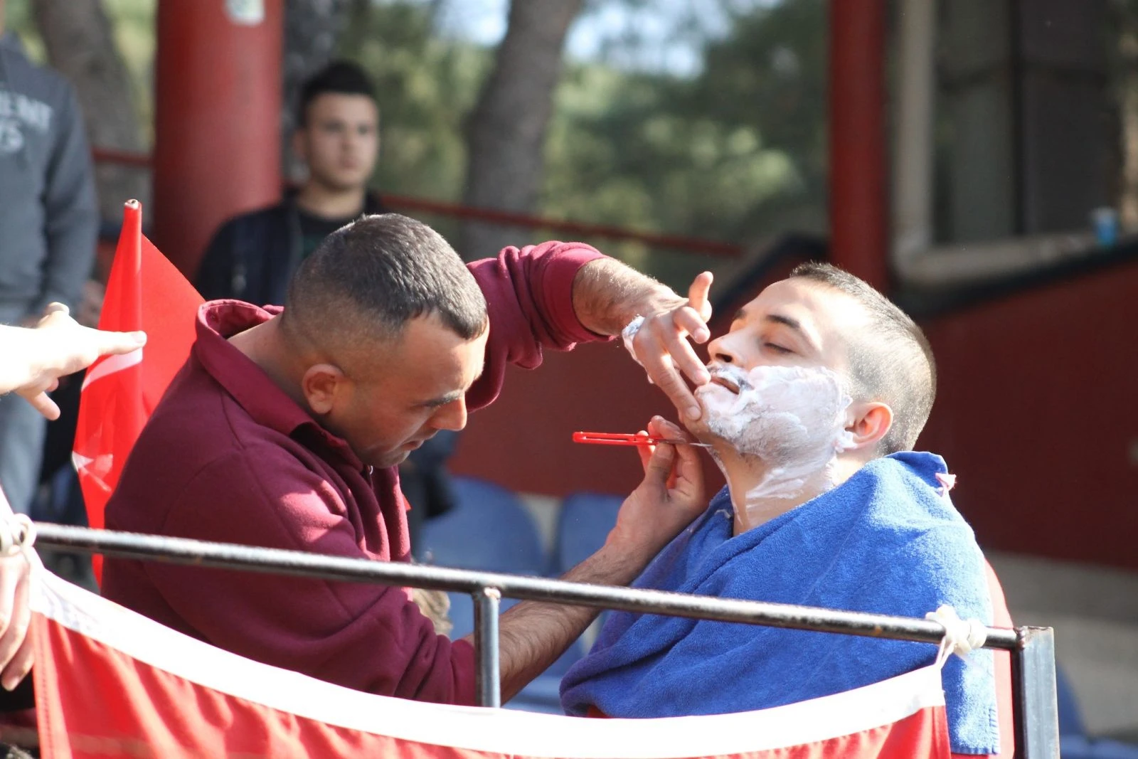 Spor Toto Bölgesel Amatör Lig’de Ödemişspor’un Yıldırım Belediyespor’u 2-1 yendiği maçın devre arasında tribünlerde ender görülen bir durum yaşandı. Ödemişspor’un hiçbir maçını kaçırmayan Çamlık Tayfa üyesi Çağrı Ayyürü’nün asker tıraşı maçın devre arasında Ödemiş Saraçoğlu Stadı’nın tribünlerinde yapıldı.