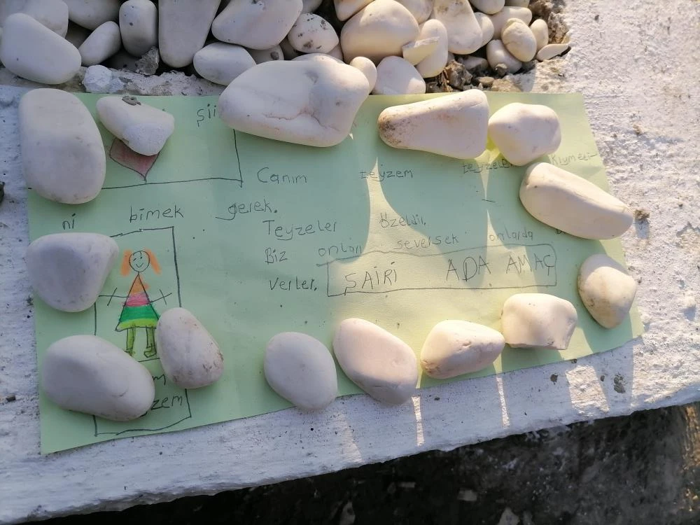 Rıza Bey Apartmanı enkazından 91 saat sonra kurtarılan Ayda Gezgin'in (4) merhum annesi Fidan Keskin Gezgin'in (40) mezar taşına ise bir çocuk tarafından not bırakıldı.