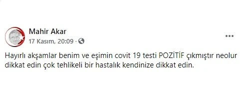 Eşiyle birlikte virüse kapılarak evde karantinada olması nedeniyle babasının acı haberini sosyal medyadan yaptığı paylaşımla duyuran Mahir Akar(57), paylaşımında hastalığa karşı uyarılarda bulundu.