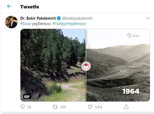 Tarım ve Orman Bakanı Bekir Pakdemirli, sosyal medya hesabı üzerinden “Sivas yeşilleniyor, Türkiye yeşilleniyor” cümleleri yaptığı paylaşımında, Sivas’ta 50 yıl içerisinde yaşanan değişimi, 50 yıl ara ile çekilmiş iki fotoğraf karesiyle ortaya koydu.