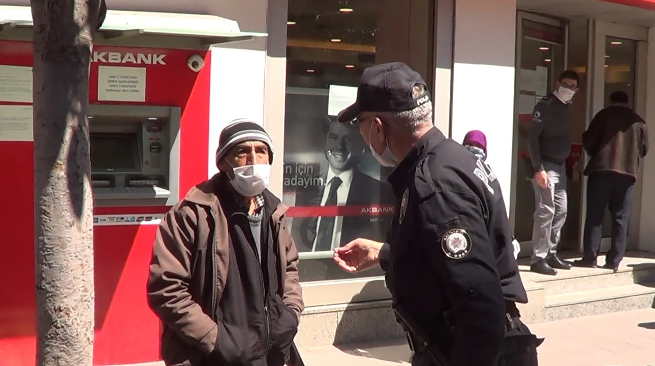 Halkı sosyal mesafe konusunda yaptığı anonslarla ikaz eden polise banka önünde bekleyen bir vatandaş, başka birinin sıranın önüne geçtiğini ve kendisini defalarca uyarmasına rağmen sıranın sonuna geçmediğini söyledi.